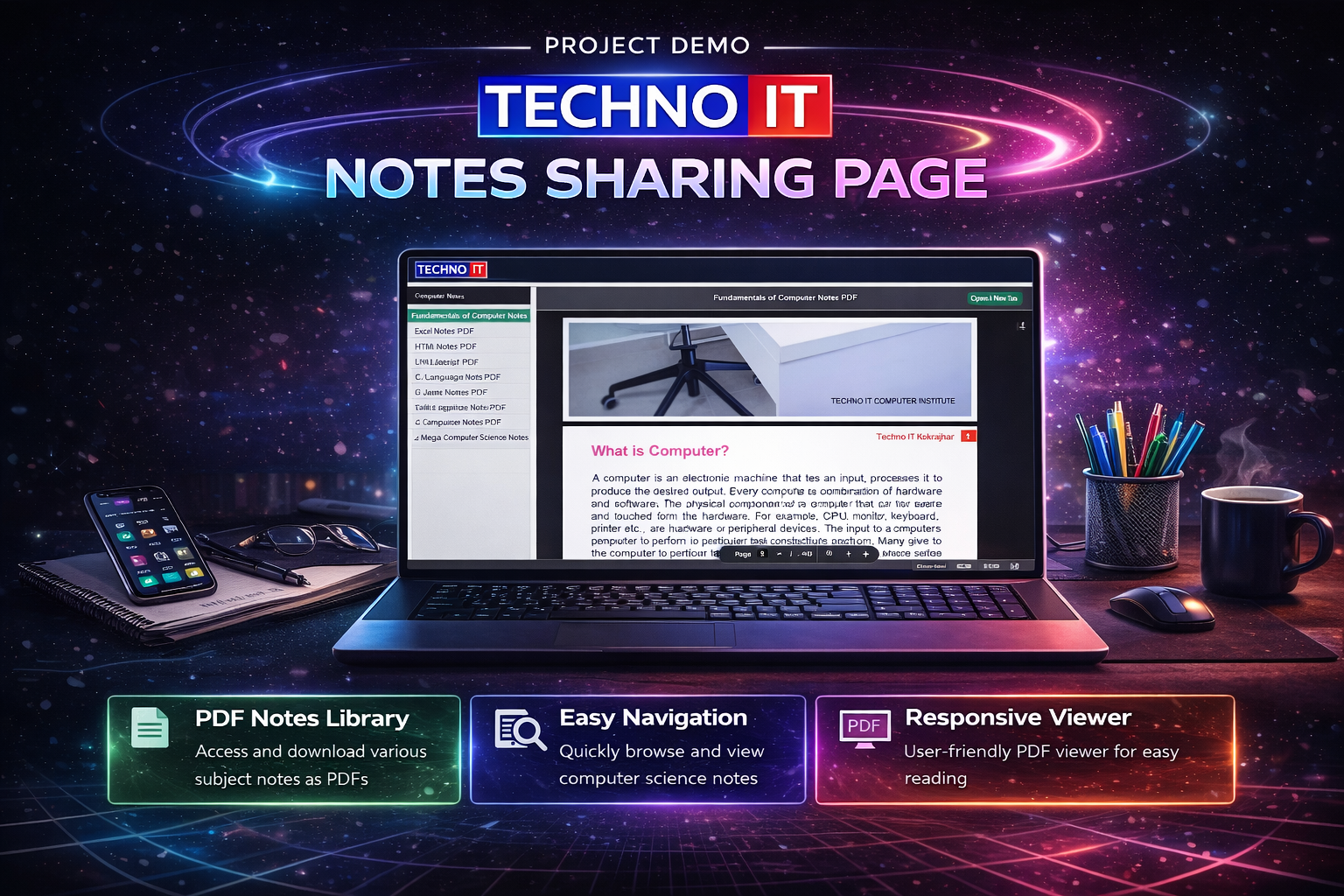 Techno IT Notes Sharing Page is a web-based learning resource platform designed to provide students with easy access to computer course notes in PDF format. It features organized subject-wise navigation, an embedded PDF viewer, and responsive design for smooth reading across devices.